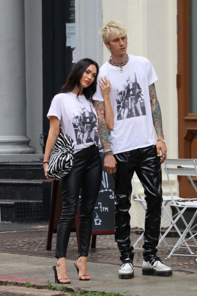 Сегодня пара в очередной раз продемонстрировала свои навыки double dressing. Для выхода они выбрали одинаковые белые футболки с принтом на груди и кожаные брюки. Меган дополнила образ черно-белой сумкой Bottega и лаконичными босоножками. А Колсон гармонично завершил аутфит белыми Dr. Martens на массивной подошве.