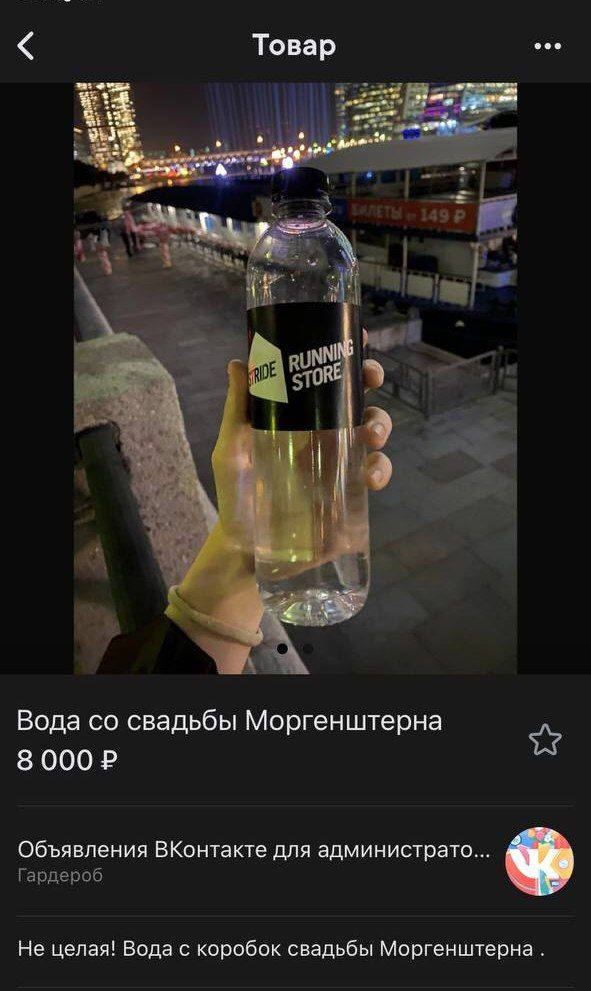 Происхождение воды неясно, но в объявлении утверждается, что бутылка прямиком со свадьбы Моргенштерна.